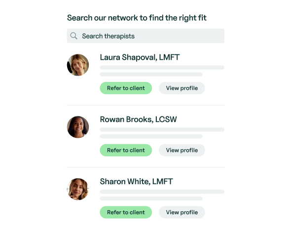 Connect clients with the right care when you're unable to take them on yourself. Easily search and filter through a network of verified SimplePractice clinicians based on specialties, location, and availability. Maintain professional relationships while ensuring your referred clients receive the specialized care they need.