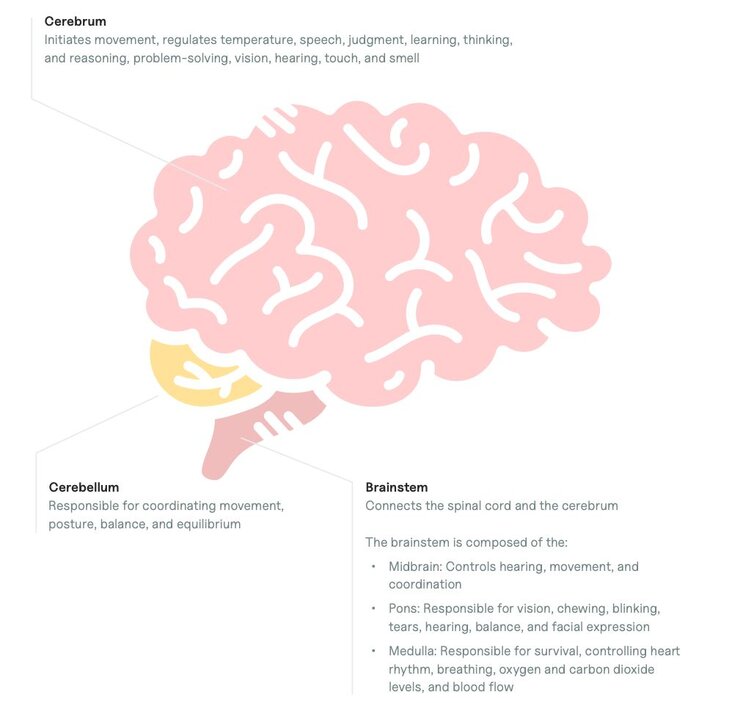 - Midbrain: Controls hearing, movement, and coordination